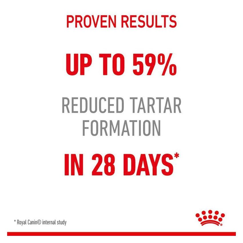 ROYAL CANIN® Dental Care is a nutritionally complete and balanced formula specially designed to help support your cat’s dental health and oral hygiene. ROYAL CANIN® Dental Care dry formula is enhanced with an active dental agent which binds to the calcium in your cat’s saliva to help reduce the formation and build-up of tartar. This diet features specially designed kibble with a specific texture that helps to polish your cat’s teeth. This brushing effect helps to limit the build-up of harmful plaque and tartar during each meal. ROYAL CANIN® Dental Care has proven results. Our study* showed that this diet helped to significantly reduce tartar formation on the participating cats’ teeth by up to 59% in just 28 days. *Royal Canin internal study.