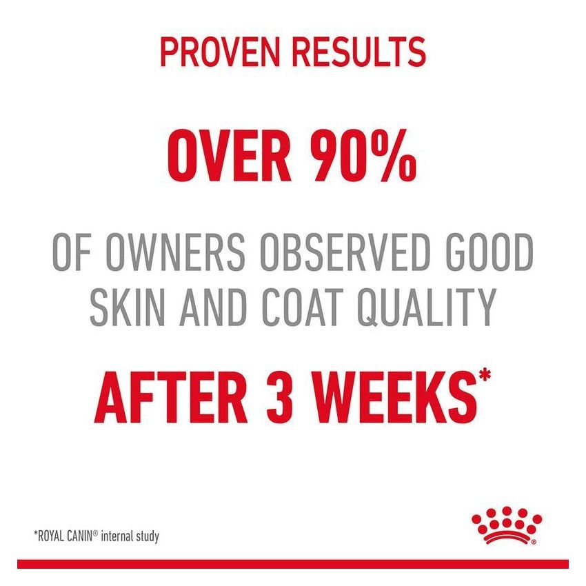 Over 90% of owners observed good skin and coat quality when fed with ROYAL CANIN® HAIR & SKIN CARE dry and wet formulas after 3 weeks.* *Royal Canin internal study