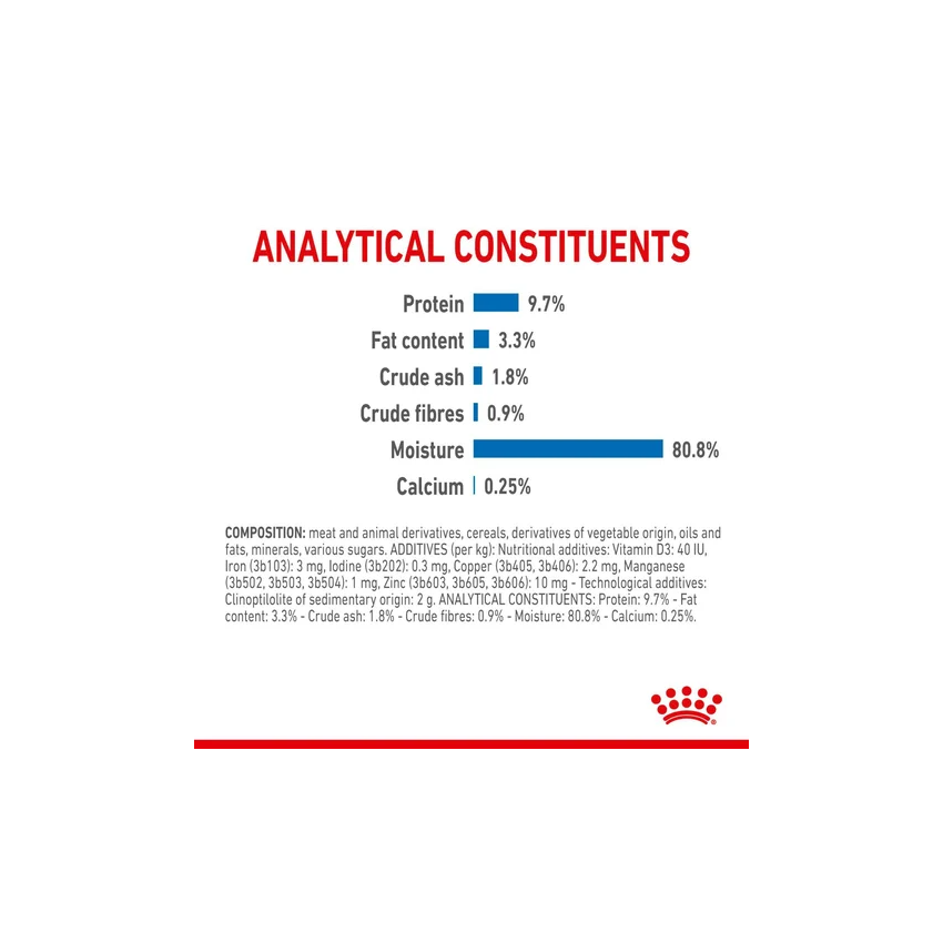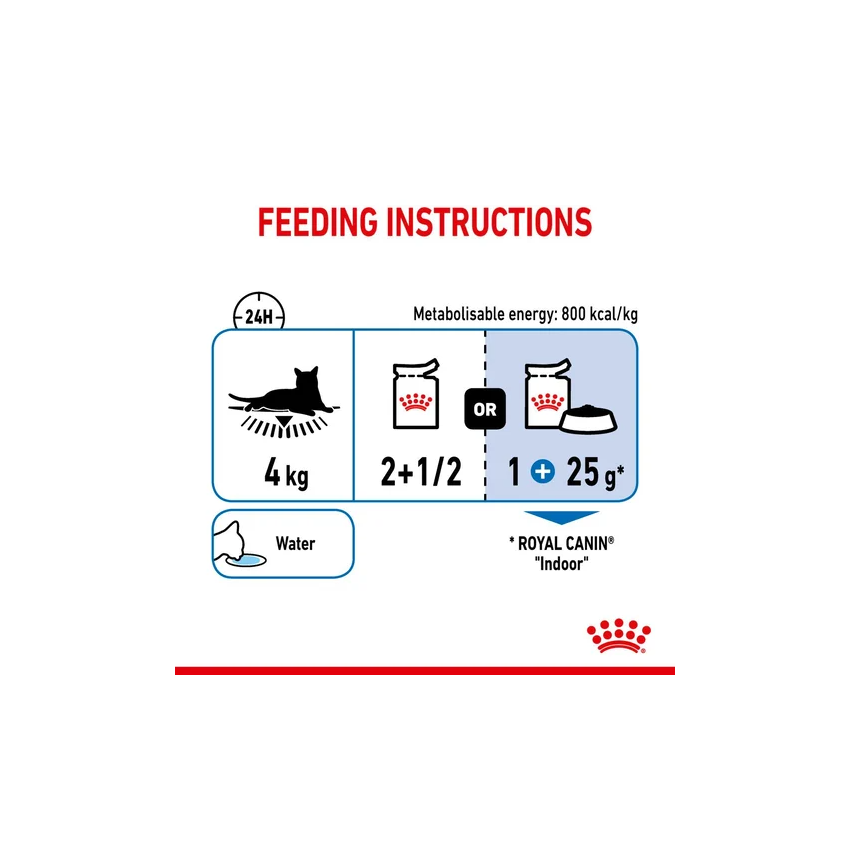 ROYAL CANIN® Indoor Sterilised in Gravy is a specially crafted recipe for indoor neutered cats like yours. This product contains highly digestible proteins for healthy stools, with a precise balance of minerals to help maintain the health of your cat's urinary system. This recipe contains the optimal balance of fats, carbohydrates, and proteins that your indoor cat craves. Following scientific trials and studies, this recipe has been loved by many indoor cats and their owners. To further appeal to your cat’s appetite, ROYAL CANIN® Indoor Sterilised wet food is also available in two alternative textures: ROYAL CANIN® Indoor Sterilised Loaf and ROYAL CANIN® Indoor Sterilised in Jelly. Be sure to follow the on-pack feeding guide to make sure your cat gets the right amount of food.