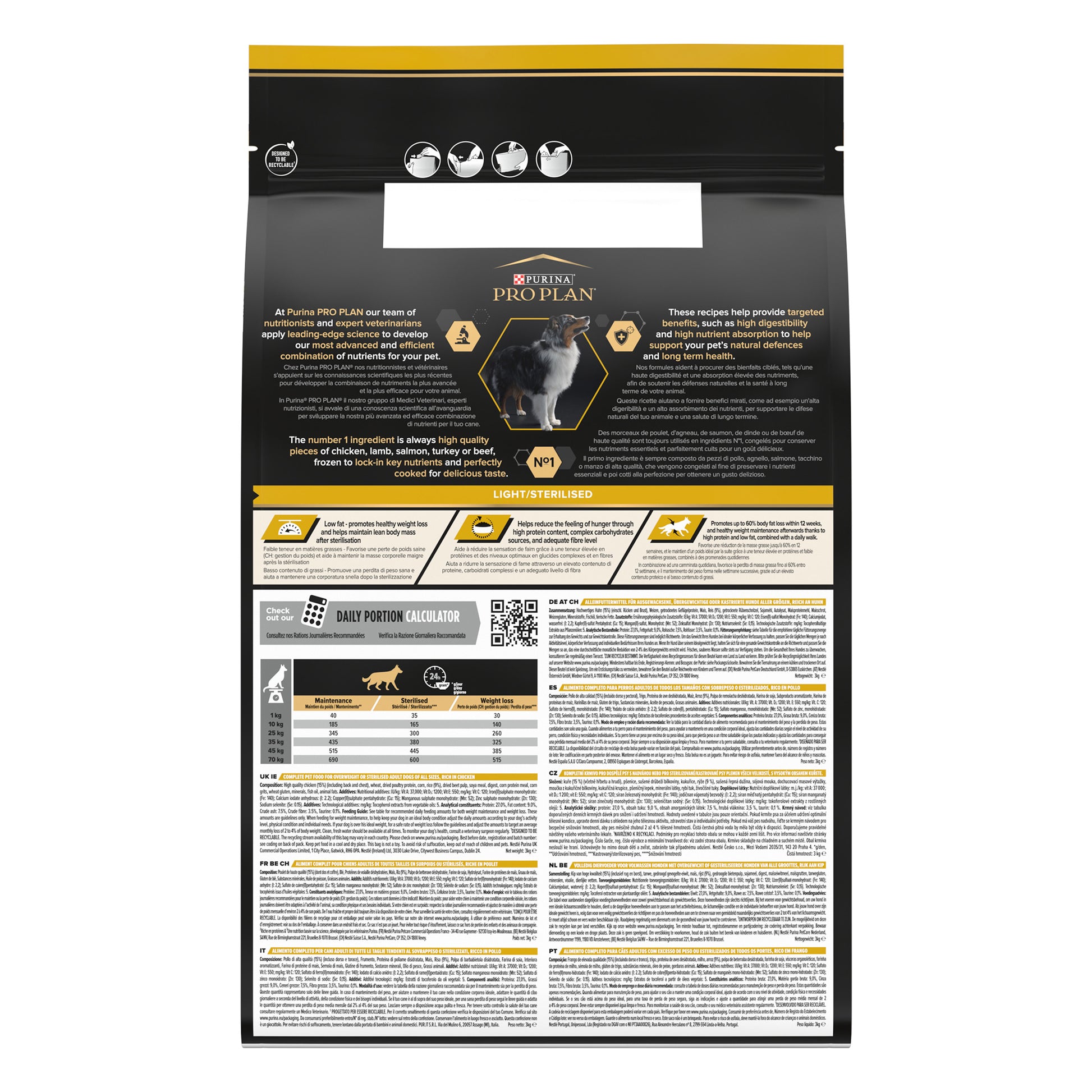 • High-quality chicken as the first ingredient. • Optimised protein and fat levels to promote weight management. • Proven to promote weight loss with a body fat loss of up to 60% within 12 weeks. • Lower fat content promotes weight loss and healthy weight maintenance. • High protein, complex carbohydrates, and adequate fibre reduce hunger. • Suitable for all dog breeds (12 months and older). • Contains vitamin D, minerals, and omega-3 (0.3%) to support healthy teeth & gums. • Provides optimal nutrition for dogs' adventures. • Science-based formula with no added colorants. • Suitable for dogs that would benefit from weight management and those that are sterilised. |