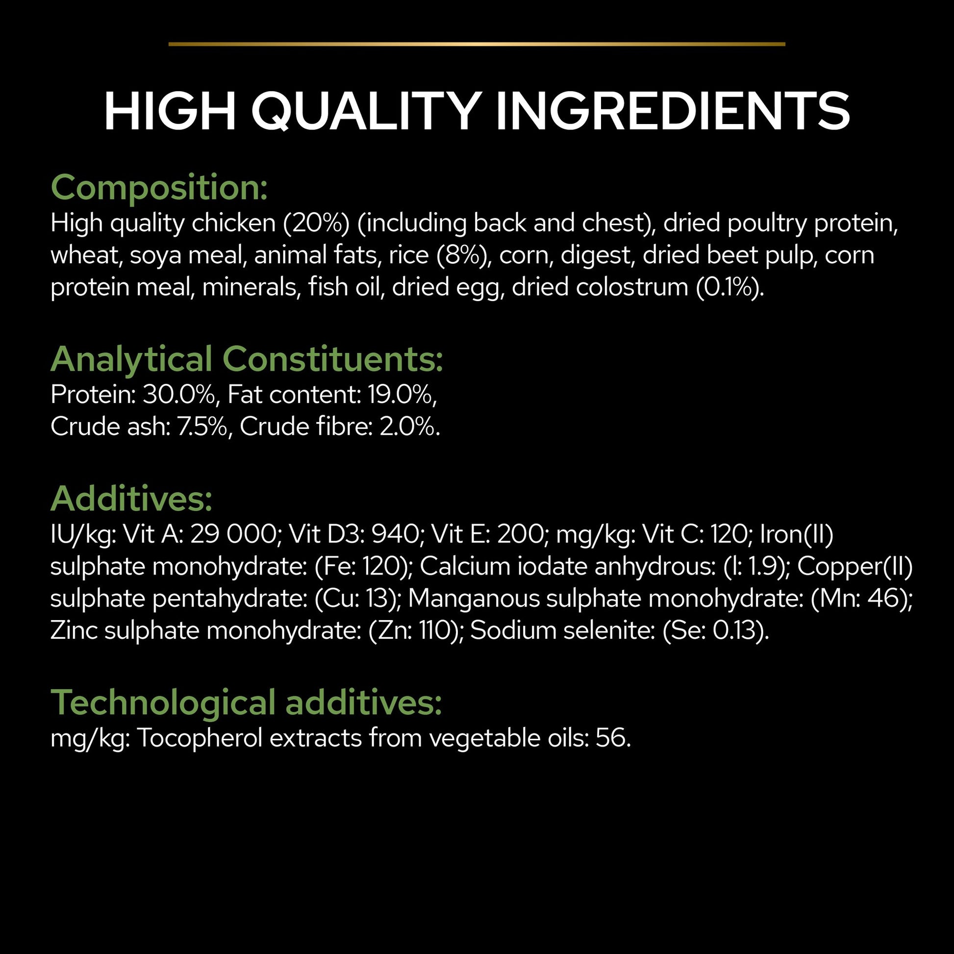 • Supports healthy growth and development with high-quality chicken as the #1 ingredient. • Contains colostrum to strengthen the immune response by up to 50% • Helps optimise gut microflora balance and reduce loose stools. • Adjusted protein & fat levels promote healthy growth and long-term health. • Nutrients that support healthy joints. • Suitable for medium breed puppies (10-25 kg adult weight). • Contains vitamin D, minerals, and omega-3 (0.3%) to support healthy teeth & gums. • Provides optimal nutrition for growth up to 12 months • Suitable for gestating/lactating mother dogs. • Science-based formula with no added colorants. • Formulated for Total Dental Care. |