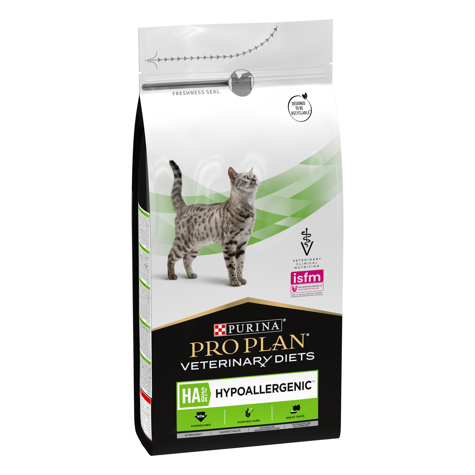 Purina Pro Plan HA Feline Formula provides a single hydrolyzed protein source and purified carbohydrate, making it ideal for diagnosing and managing food allergies in cats.