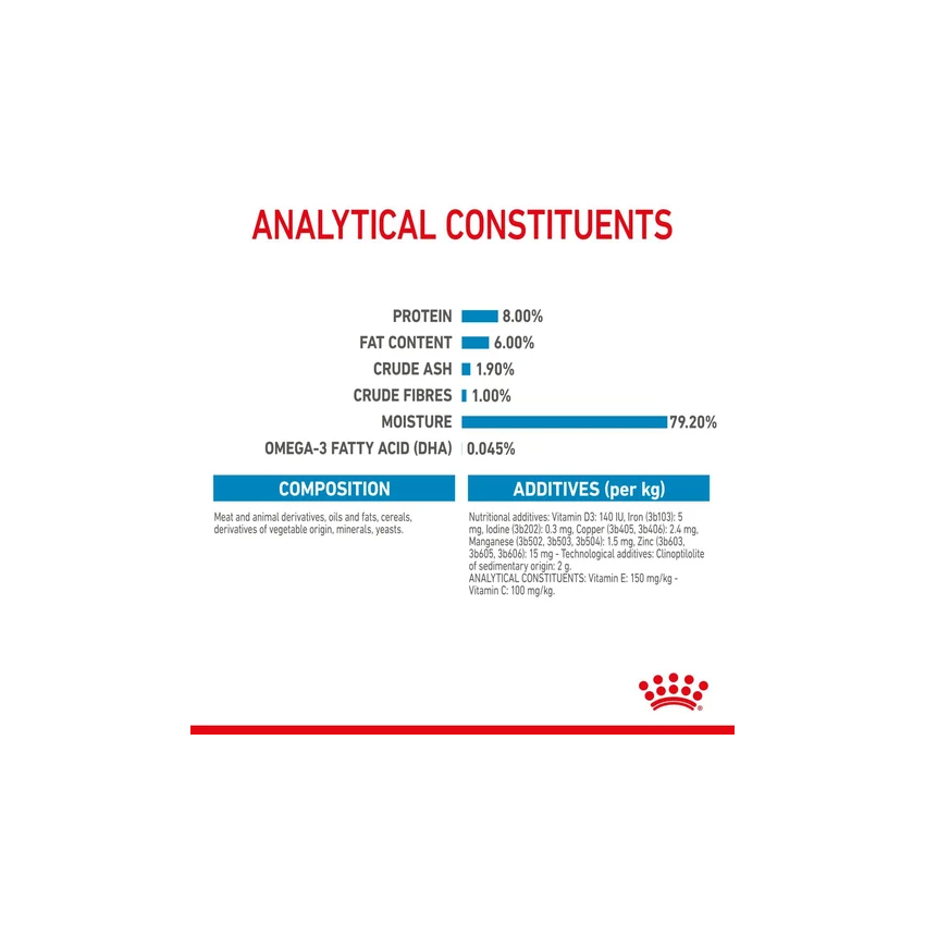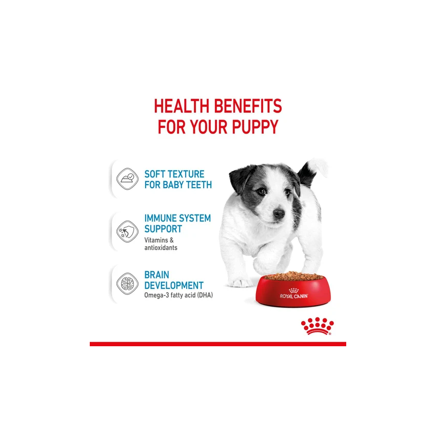 Small breed puppies grow very fast. During their intense growth period, they need enough calories and the right nutrients to grow healthily. This is a time when your puppy's bones, muscles, senses and nervous system are developing. It's also the period when the antibodies your puppy got from their mother's colostrum weaken, meaning they need optimal protein to build their own immune system. ROYAL CANIN® Mini Puppy in Gravy is specially formulated to support the nutritional needs of small breed puppies. This formula is suitable for 2 to 10-month-old puppies that should reach an adult weight of 4-10kg. This tailored diet contains appetising chunks in gravy, designed with a size, texture and taste that's perfect for small breed, growing puppies. This formula contains nutrients such as vitamins C and E to help support the puppies' natural defences while their immune systems are still developing. The formula is also enriched with omega-3 fatty acids (such as DHA) to help support healthy brain development in puppies. Thanks to a combination of beneficial prebiotics and highly digestible proteins, ROYAL CANIN® Mini Puppy in Gravy also helps to support a healthy balance of intestinal microbiota (gut flora) for good digestion. ROYAL CANIN® Mini Puppy in Gravy has been created to satisfy the most delicate canine palate. This wet food offers your puppy a positive sensory experience, supports healthy hydration and is perfect for mixed feeding with the ROYAL CANIN® Mini Puppy dry kibble diet. Did you know that a puppy's nutritional needs change as they grow? By the time your puppy reaches 10 months old, they will need a diet that's specially adapted to meet their nutritional needs as a grown dog. At this stage, you can transition them onto ROYAL CANIN® Mini Adult, available either as a dry kibble diet or with wet chunks in gravy. At Royal Canin, we're committed to creating a better world for cats and dogs. For more than 50 years, we've worked closely with breeders, vets, and pet experts, sharing specialist knowledge and scientific research to create a dedicated approach to individualised, precise nutritional solutions. All of our products undergo an extensive quality control process to guarantee the optimal quality of food. When your small breed puppy eats ROYAL CANIN® Mini Puppy in Gravy, they're getting a complete and balanced diet.