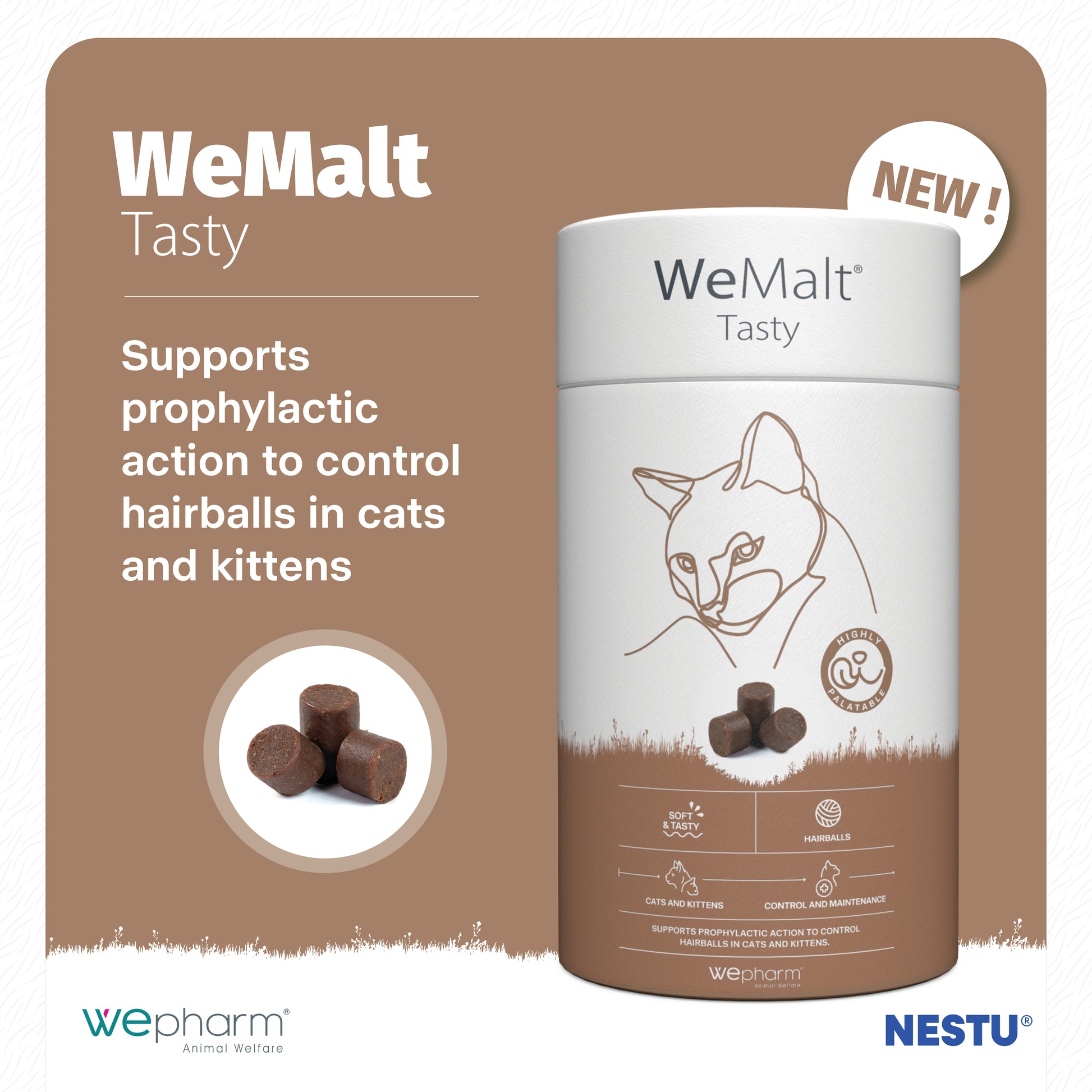 WeMalt® Tasty is a complementary feed supporting prophylactic action to control hairball in cats and kittens. When cats & kittens lick their fur, they can accumulate it in the stomach in the form of hairballs.