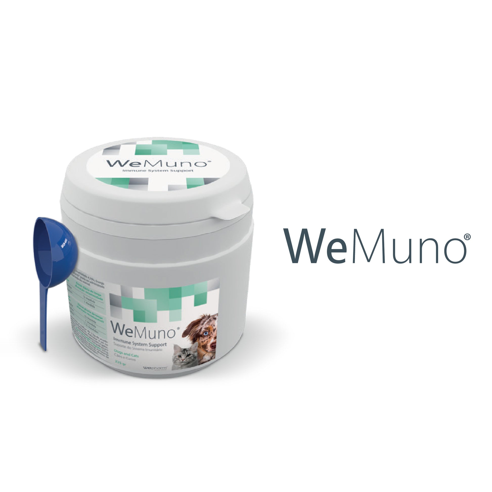 WeMuno® Palatable powder Complementary feed for cats and dogs, designed to support the immune system. Contains Ashwagandha, Shiitake, Curcumin and Green Tea Extract, that aim to replenish the immune system and provide a source of vitamins and minerals; iron and selenium that boost energy and vitality. WeMuno is blend of ingredients that aim to support the immune system in a wide array of situations where it may be compromised, or when there is a need to combat aggressions to the body by foreign invaders.